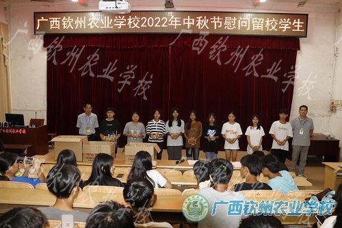 2022年9月10日,在中秋佳节、教师节双节来临之际,我校有近400名同学因为疫情要求,不能离钦留在学校过节。当晚9:30,留校的同学代表近200人集中电化教室,学校纪委书记、副校长陈明强集中慰问了留校学生,为大家送上节日的祝福和中秋慰问品。