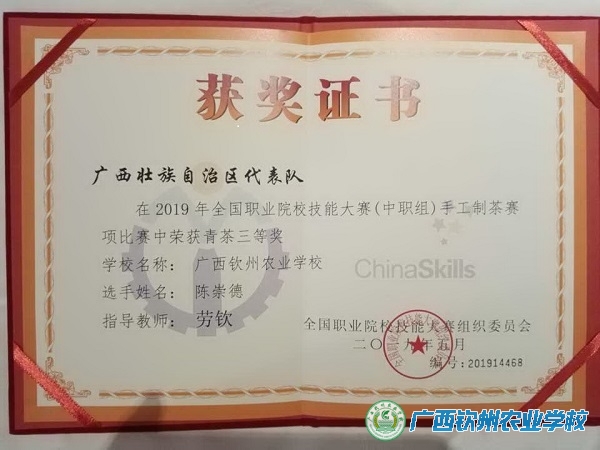 5月25-26日,2019年全国职业院校技能大赛(中职组)手工制茶赛项比赛在湖北五峰举行,我校参赛选手加工171班陈崇德参加手工制茶青茶分赛项的比赛,在指导老师劳钦的指导下,不畏强手,不畏艰辛,刻苦训练,结合常规练习及在赛前一个星期的通宵达旦的适应性训练中,有针对性地加强弱项强化练习、加强对关键因素的把控,克服种种障碍,凭借扎实的凭借扎实的基本功、娴熟的技能操作和过硬的心理素质,脱颖而出,勇夺该赛项三等奖!