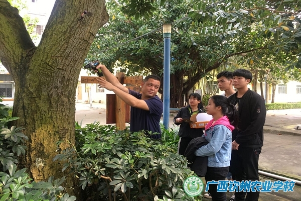 3月20日,早春时节,甘向平老师带领我校园林班的同学来到校道旁果树下,给学校的绿化功臣,空气清洁能手——校道的芒果树、荔枝树、龙眼树进行了蛀干害虫的防治工作,同学们认真听老师讲解技术要领,按要求在树干相应位置打孔,并插入防蛀药瓶,给果树们打上了“点滴”,虽然春雨绵绵但大家依然热情满怀,期盼着今年又是一个丰收年。