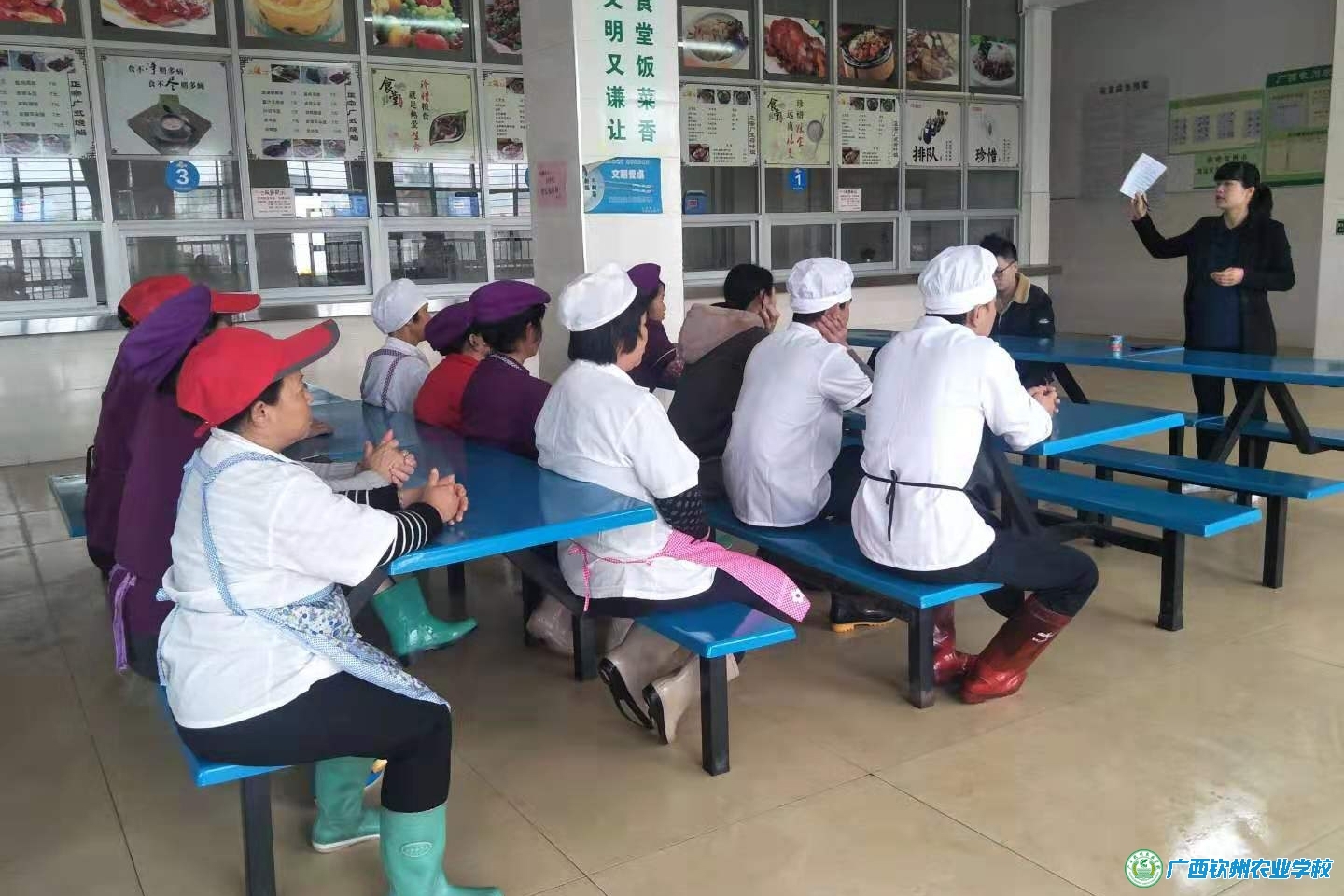 食堂主管经理在培训中传达了《国务院办公厅关于进一步做好非洲猪瘟防控工作的通知》、《关于强化2019年钦州市学校及周边食品安全的通知》等文件精神,强调了学校食品安全的重要意义和工作原则,对食堂场所布局、加工操作流程、原料采购贮存、索证索票、餐具清洗消毒、从业人员个人卫生、食品留样等情况进行全面讲解,并要求从业人员按各自岗位工作认真贯彻落实,确保学校食品安全。