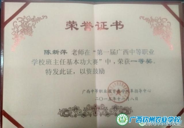 2016年参加自治区教育厅举办的全区教师技能比赛导游服务项目获得二等奖;2017年春季、2018年春季分别指导2名学生参加自治区教育厅举办的“助学筑梦,励志成才,担当有为”征文比赛,1人获得一等奖,1人获得优秀奖,其本人获得“优秀指导教师”称号,学校在2017年的比赛中获得优秀组织奖;2017年秋季学期指导3名学生参加钦州市第六届中等职业学校技能比赛学前教育五项技能的讲儿童故事比赛,1人获得一等奖,2人获得三等奖,其本人获得“优秀指导教师”称号;2018年春季学期指导1名学生参加自治区教育厅主办的学前教育专业五项全能比赛获得三等奖,其本人获得“优秀指导教师”称号;2018年春季学期参与指导的2名选手参加自治区教育厅主办的茶艺比赛项目并获得三等奖。
