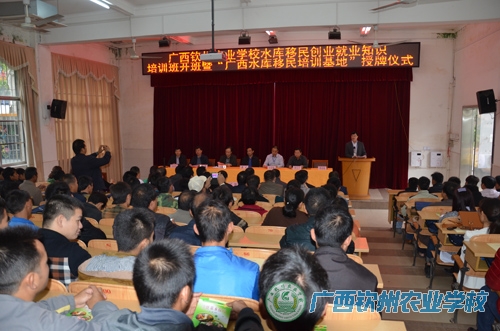 在开班典礼上,谭峰副局长、李凡宁副书记代表自治区水库移民工作管理局为我校授予“广西水库移民培训基地”牌匾,谭峰副局长作了讲话,对我校的师资力量、教学条件表示充分肯定,对本次培训充满信心,同时希望学员顺利完成培训任务,掌握一技之长,将来走上致富的道路。