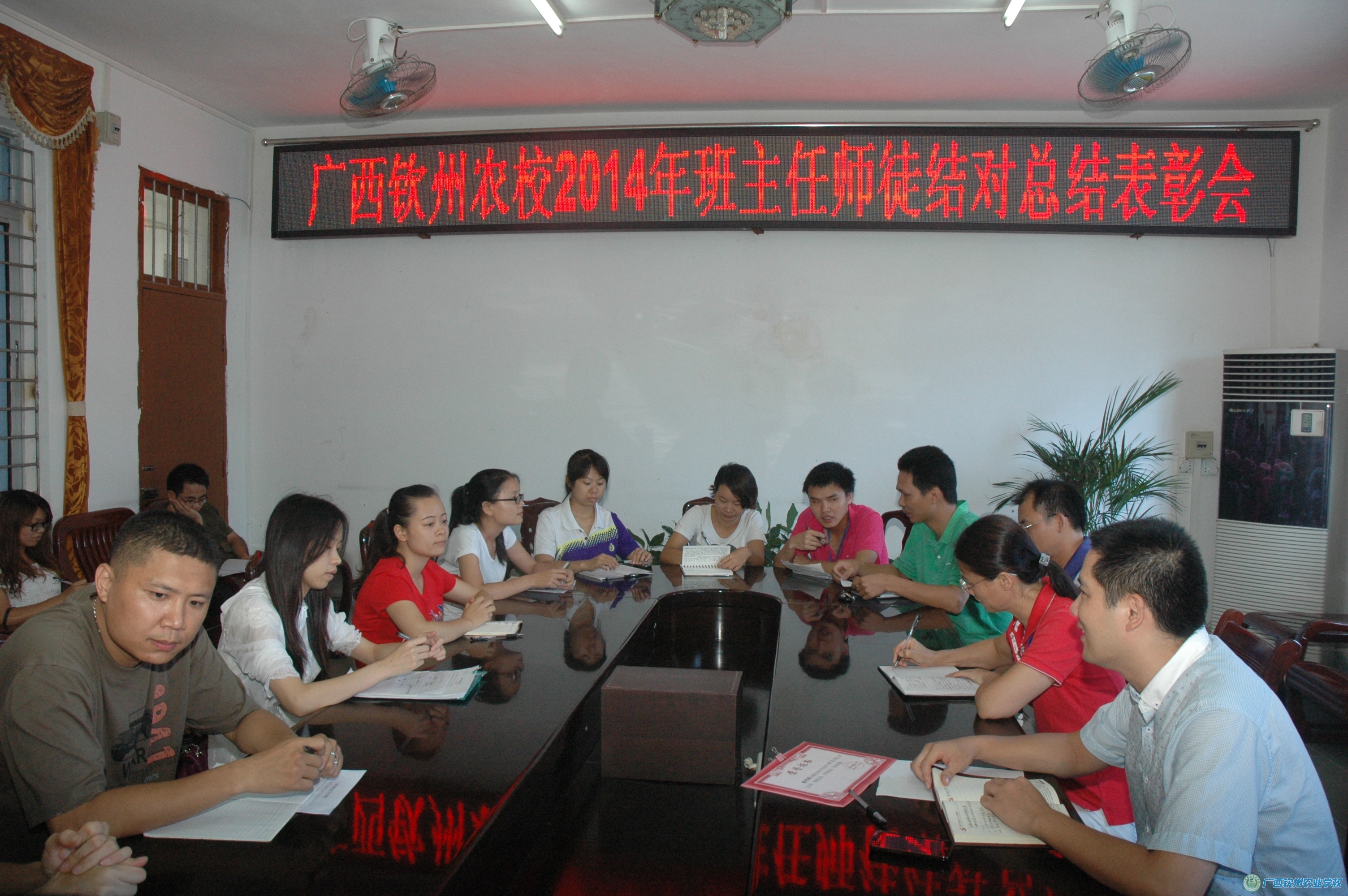7月5日下午,我校在第一会议室隆重举行了2014年班主任师徒结对总结表彰会。会议由学生科邓业斌科长主持,覃一静副校长和10对班主任结对师徒参加了表彰会。