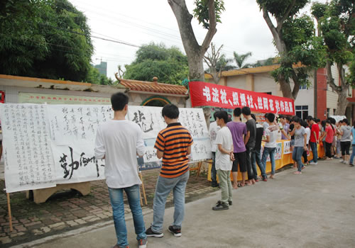 2014年6月25日下午4:30,由书法社、织绣社、丝网花社举办作品展在学校主校道举行。一件件生动的作品、一幅幅精致的字画吸引了过往师生的目光,还有不少人拿出相机拍照留念。此次的作品展是在邓玉琴、农晓琼、秦玉娥三位指导老师的指导下,三个社团的成员利用课余时间制作完成的。虽然作品略显生涩,技艺水平仍有待提高,但还是显示出了同学们对社团活动的热情及对美好事物的向往。