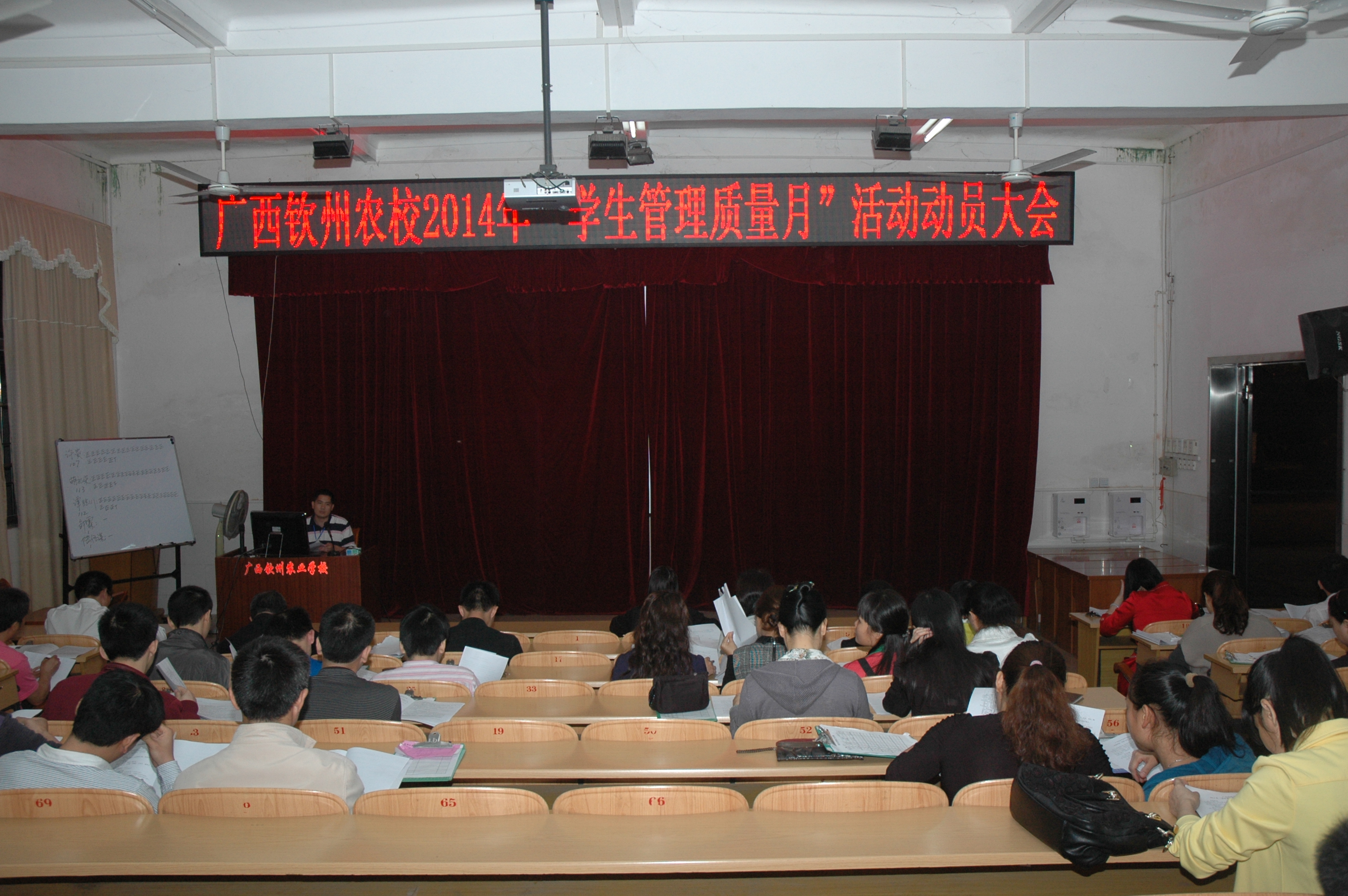 2014年4月7日我校在电化室召开“学生管理质量月”活动动员大会,学生科邓业斌科长在会上作了开展“学生管理质量月”活动的动员讲话,宣读了“学生管理质量月”的活动方案。