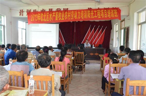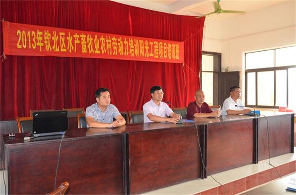 根据自治区农业厅、财政厅等四部门联合下发的《关于印发2013年全区农村劳动力培训阳光工程实施项目实施方案的通知》、自治区水产畜牧兽医局下发的《关于印发2013年广西水产畜牧业农村劳动力培训阳光工程项目实施方案的通知》和钦北区水产畜牧兽医局、财政局《关于印发2013年钦北区水产畜牧业农村劳动力培训阳光工程项目实施细则的通知》文件精神,我校承担了钦北区水产畜牧业农村劳动力培训阳光工程项目培训。由于时间紧,任务重,为此,学校制定了培训工作实施方案,成立领导工作小组,落实了培训教师、培训时间和对象,克服重重困难,圆满完成了自治区下达的550人培训任务。其中,组织下乡专项技术培训:450人(大直镇96人、大寺镇41人、平吉镇64人、青塘镇32人、长滩镇60人、新棠镇89人、大垌镇68人、),在校职业技能培训:100人。进一步提升了钦北区水产畜牧从业人员从业技能和综合素质。