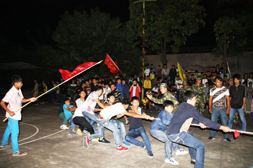 为增进新生军训班际间的交流,丰富军训生活,9月24日、9月26日晚,我校在灯光球场举行了新生军训拔河比赛。