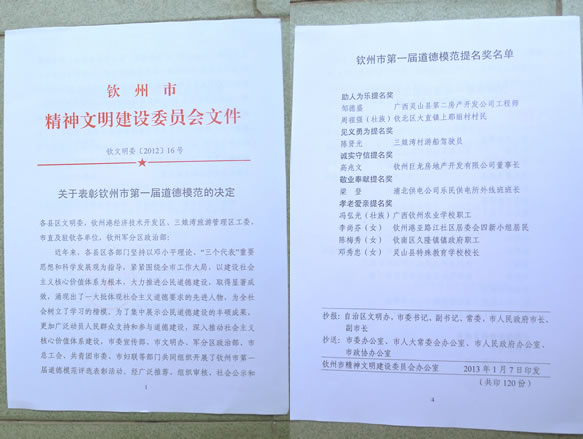 根据钦州市精神文明建设委员会文件《关于表彰钦州市第一届道德模范的决定》(钦文明委〔2012〕16号)精神,我校冯弘光同志荣获“钦州市道德模范孝老爱亲提名奖”。