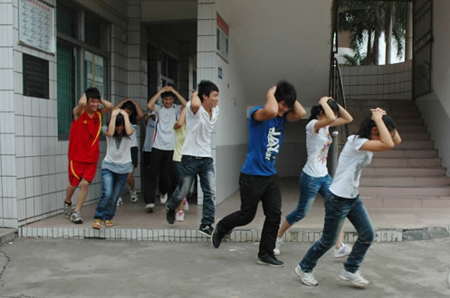 上午11:20,学校上空突然响起紧急的报警钟声,这是发生“地震”、紧急避险的指令!听到指令,正在上课的学生在任课老师引导下,唰地一下,大家全都双手抱头,就势蹲躲在书桌底下,图书馆内的师生也用手护头,躲到阅览桌、借书台下,避开楼房横梁,在教学楼的实验楼一楼上课的师生也快速走出教室(实验室)。1分钟后,学生纷纷从室内来到走廊和楼梯,1分30秒钟后,第2次报警钟声响起,在老师的指导下,学生们纷纷从各自教室有序地快速撤离教室、实验室、图书馆等建筑物,疏散到球场、操场和校道等空旷地带。至此,整个演练全部结束。