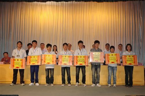 在表彰大会上刘波校长、伍国樑副校长、覃一静副校长、李红调研员、工会陆武昌主席亲自为获奖的班级和获奖的同学颁奖,参与颁奖大会的相关科室负责人也分别为获奖的班集体和获奖的同学颁奖。在颁奖过程中,优秀学生代表李载伟同学、优秀学生干部代表刘艳兰同学和优秀班主任代表吴明老师分别作了获奖感言。
