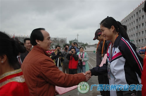 2009年11月18日下午,钦州农校鼓乐喧天,人头攒动,热闹非凡。学校领导、各相关部门负责人、学生会、团委会全体干部、青年志愿者和护校队全体成员,以及500多名师生,在中心校道列队欢迎参加区农业厅属中等职业学校第十一届学生运动会的我校代表团载誉归来,学校领导为代表团成员献上了鲜花。在一片掌声和欢呼声中,学校领导和代表团一起,走进电化教室,学校为代表团举行一个简单而隆重的欢迎仪式。在欢迎仪式上,伍国樑副校长致欢迎词,代表团领队陆武昌主席和总教练裴朝发老师分别作了参赛情况汇报。