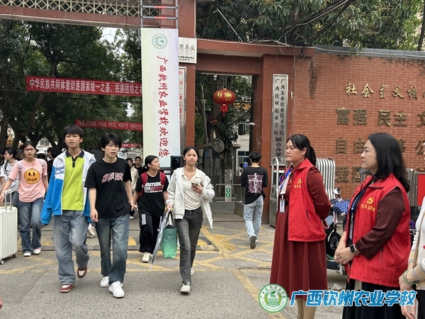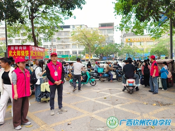 2025年3月28日,正值广西“三月三”放假离校,下午4:10分下课后,学生如潮水般走出校门,第三党支部党员身穿红色志愿服,根据分工安排提前到位,分布在内外校门处值守,引导车辆有序通行、停靠,提醒学生注意交通安全,确保每位学生安全离校。