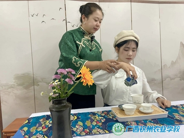图四为杨灵灵老师指导学生倒茶手法
