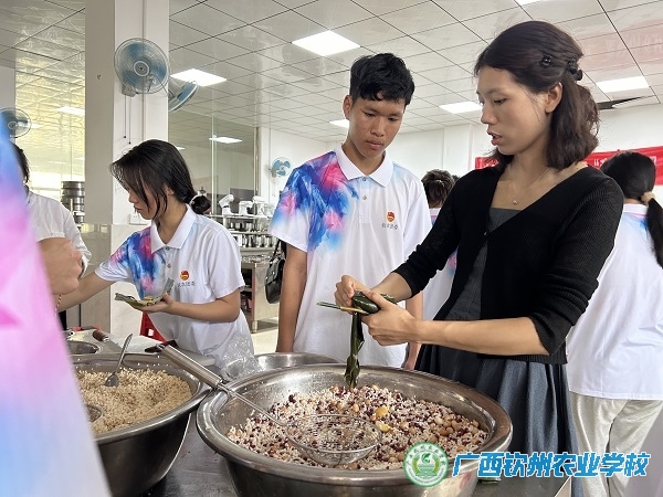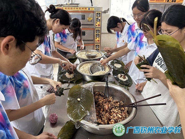随后,烹饪老师丁洁老师亲自上场,为大家展示了包粽子的技巧。她详细介绍了粽子的制作材料、步骤和注意事项,并亲自示范了如何包粽子。在丁洁老师的悉心指导下,团员们纷纷动手实践,有的小心翼翼地折叠粽叶,有的认真地添加糯米和馅料,还有的互相交流心得和技巧。不一会儿,一个个形状各异的粽子便诞生了。大家看着自己的劳动成果,脸上洋溢着喜悦和自豪的笑容。