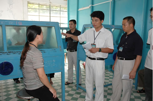 刘波校长(左一)在仔细观看陈文浩老师的“可控台灯制作”比赛伍国樑副校长在仔细观看黎燕老师的“CAD设计”比赛参赛教师回答专业评委的提问教学评委认真观看“CAD设计”操作演示