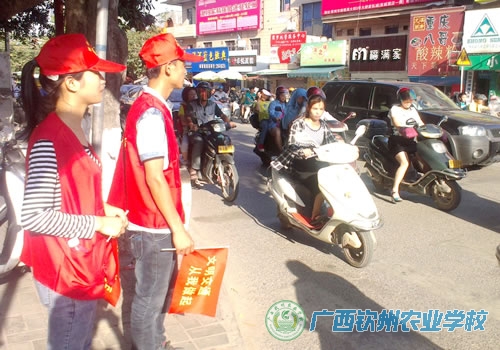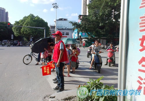 “请等到绿灯亮时再走斑马线过马路,谢谢。”2014年5月14日下午,我校团委组织的16名青年志愿者戴着“钦州志愿者”小红帽,身穿红马夹,手持“文明交通”小红旗走上街头,在小花园路口配合执勤交警进行文明交通劝导,为炎炎夏日增添了一抹靓丽的风景。