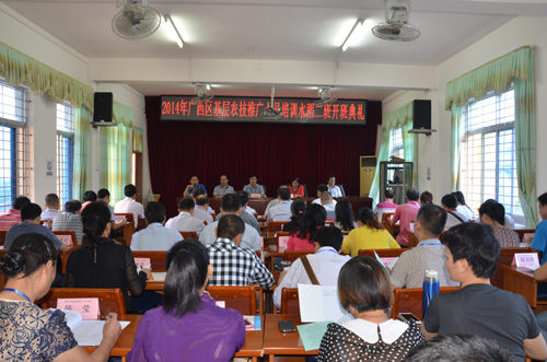 2014年广西基层农技人员培训水稻(2)班经过6天的紧张学习、考察、交流和总结,于10月18日下午在学校会议室举行了结业典礼,圆满完成了所有的培训学习。全体学员在培训过程中有很强的组织纪律性,能主动虚心的向同行学习和交流。学校覃效敏副校长在会上作了总结讲话,充分肯定了培训工作成效,并希望学员们将培训学习到的新型农业知识,充分运用到我市的基层农业生产生活中,不断提升农业科技经济效益,为广西农业技术推广工作做出积极的贡献。