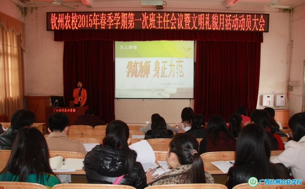 3月8日上午,我校学生科组织召开了2015年春季学期班主任培训会暨文明礼貌月活动动员大会,大会首先由学生科邓业斌科长回顾2014年秋季学期班级管理工作,对新学期进行了工作布置,解读了文明礼貌月活动方案,动员全校各班积极参与文明礼貌月活动,提高学生综合素质;接着覃一静副校长作了《学高为师,身正为范》的专题讲座,提出“八不要”和全体班主任共勉:不要缺爱心、不要无责任、不要急躁、不要爱面子、不要放任、不要硬碰硬、不要找借口和不要抱怨。