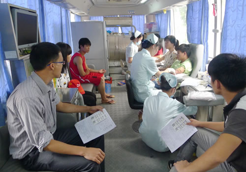 师生们在采血车上有序地参与献血