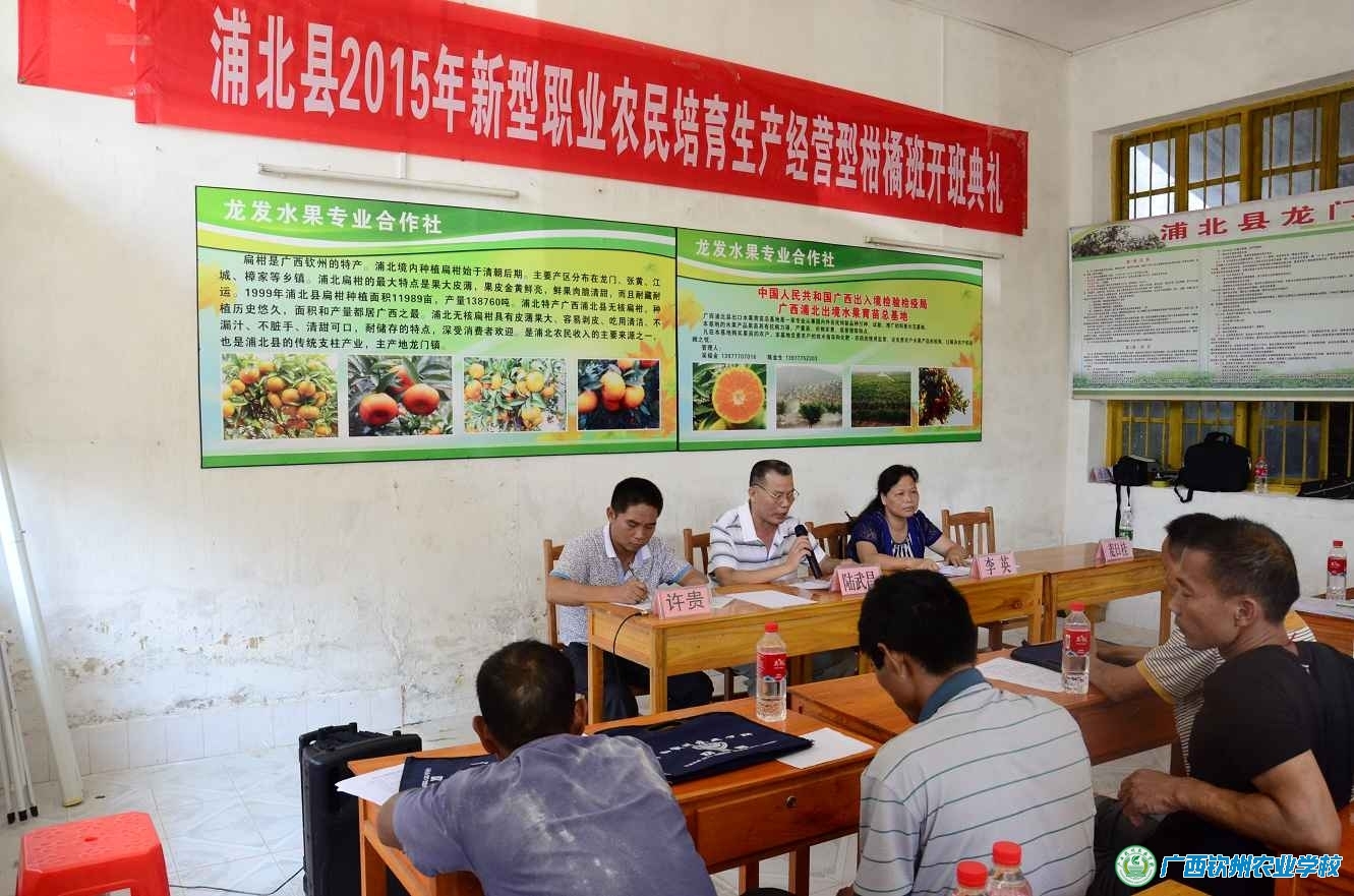 本次培训是从9月24日在浦北县龙门镇龙发水果合作社开班的,浦北县农业局精心组织了龙门镇樟家村委的47名柑橘种植大户集中到合作社进行了为期15天的培训,其中集中培训7天,田间实训8天。我校组织专业理论深厚、实践经验丰富的高级讲师对学员进行授课,主要课程有柑橘栽培技术、柑橘栽培管理(实训)、农产品市场营销、柑橘贮运与保鲜、柑橘采收、包装及保鲜技术(实训)、柑橘病虫害综合防治、柑橘病虫害识别与防治(实训)、农产品质量安全知识及生态乡村、农产品农药残留检测技术(实训)等课程,最后组织了学员进行理论知识考试。