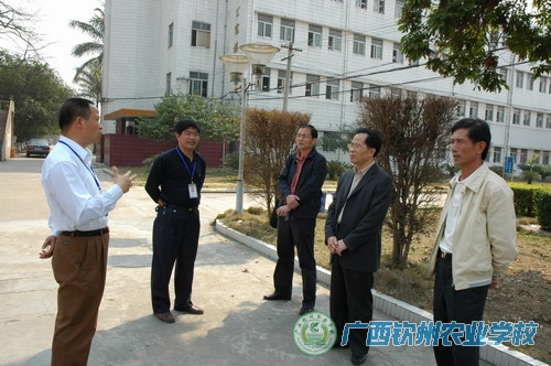 伍国樑副校长(左一)向李伟良董事长(右二)介绍学校建设发展情况