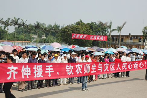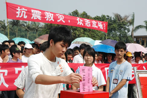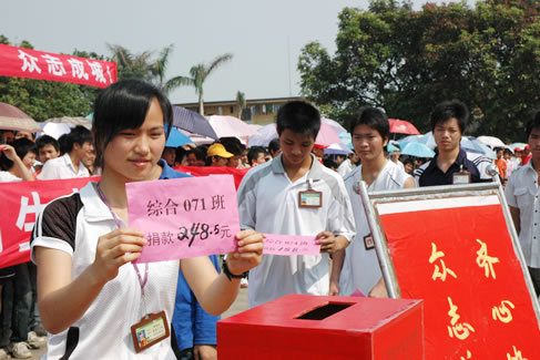 一方有难,八方支援。四川汶川地震灾情牵动着我校3000多名师生的心。我校积极响应党中央、国务院号召,向全体师生发出捐款倡议和献血倡议,并于5月16日下午在学校大操场举行有全校师生员工参加的向四川地震灾区捐款的活动。地震无情,人间有爱。校园涌动的暖流,表达该校广大师生对四川灾区人民的关爱。参加募捐活动的有学校领导、普通教职工、全体同学,还有离退休人员、个体经营户及家属,涓涓细流汇成对灾区人民浓浓的爱,经过不到一个小时的活动,总共募集到救灾款32348元。