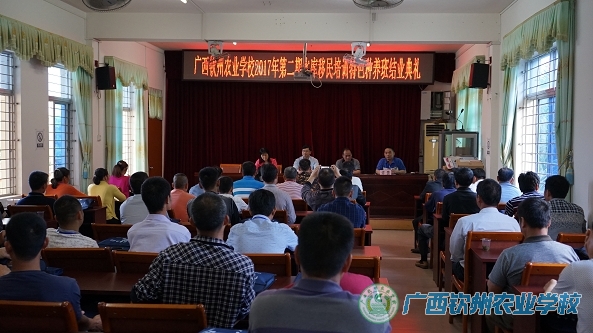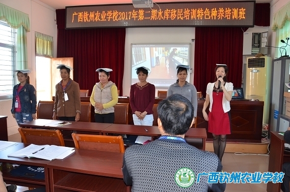 4月28日下午,我校2017年水库移民特色种养农村实用技术培训班结业典礼在学校第二会议室隆重举行,学校副校长覃效敏、培训中心许贵主任、南宁市水库移民局阮艳花、横县水库移民局黄晓喻出席结业典礼。