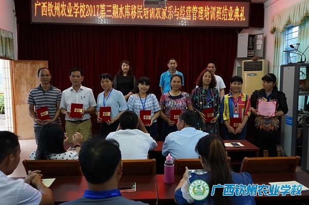 5月19日下午,我校2017年第三期水库移民农家乐经营与管理农村实用技术培训班结业典礼在学校第二会议室隆重举行,副校长陈明强、培训中心许贵主任、融安县水库移民管理局梁英枝主任出席结业典礼。