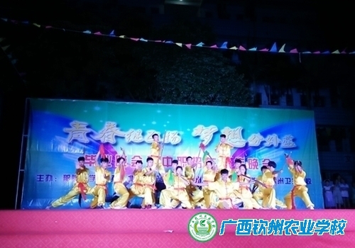 2017年6月1日晚,我校覃效敏副校长带领师生一行40人,到钦北区那蒙中学参加“青春继飞扬 梦想分外蓝” 毕业晚会暨中职招生宣传晚会。学前教育专业和武术社的同学参加了演出,他们优美的舞姿和精采的武术,赢得场下师生们的连声喝彩和阵阵掌声。