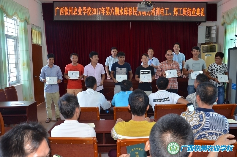 7月3日下午,我校2017年第六期水库移民就业技能低压电工、焊工培训班结业典礼在学校第二会议室隆重举行,副校长邓喜和、培训中心唐伟尤主任、隆安县水库移民工作管理局农英河主任、良庆区领队黄丞珏出席结业典礼。