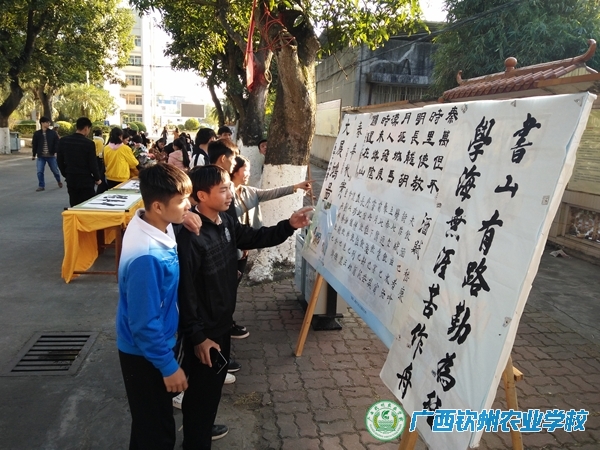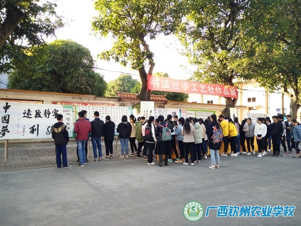 冬日暖阳映校园,社团活动展风采。2017年12月21日下午,书法社和手工艺社联合在主校道举办作品展,展出了书法作品及手工作品50余件,每一件作品都是社团成员利用课余时间书写和制作的,虽不是十分精致美观,但却蕴含着同学们的汗水。作品展吸引了师生的瞩目,大家纷纷围观,不时稍作点评,手工社成员还现场制作超轻黏土玩偶赠送给参观的老师和同学,鼓励他们加入社团一起进行创作。