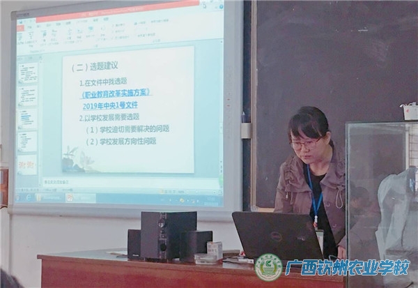 此次会议是现代农业学部2019年春季学期的第一次教师业务会,培训会上,彭主任一方面就目前教科研可申请的项目类型,如教育科学“十三五”规划课题、广西职业教育发展研究中心项目、广西农业科技自筹经费项目、钦州市科技局项目、校级项目等,都进行了详细的介绍;另一方面对不同类型项目、课题选题提出了选题与类别相适应、内容侧重点要明确等原则,如教改项目主要写教育教学改革内容,而农业厅、科技厅项目主要侧重社会应用技术研究生态环保、技术研发、产品推广等。