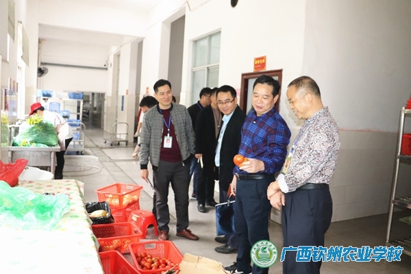 检查组在学生食堂检查蔬菜进货情况,伍国樑校长(右一)陪同