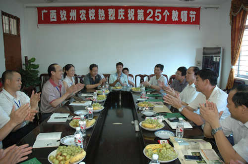 9月8日下午,在第25个教师节即将来临之际,钦州市副市长金大刚一行代表钦州市四套班子来我校亲切慰问教师,并送上节日的祝福。市政府副秘书长邓智章主持座谈会,市教育局、农业局有关领导陪同。