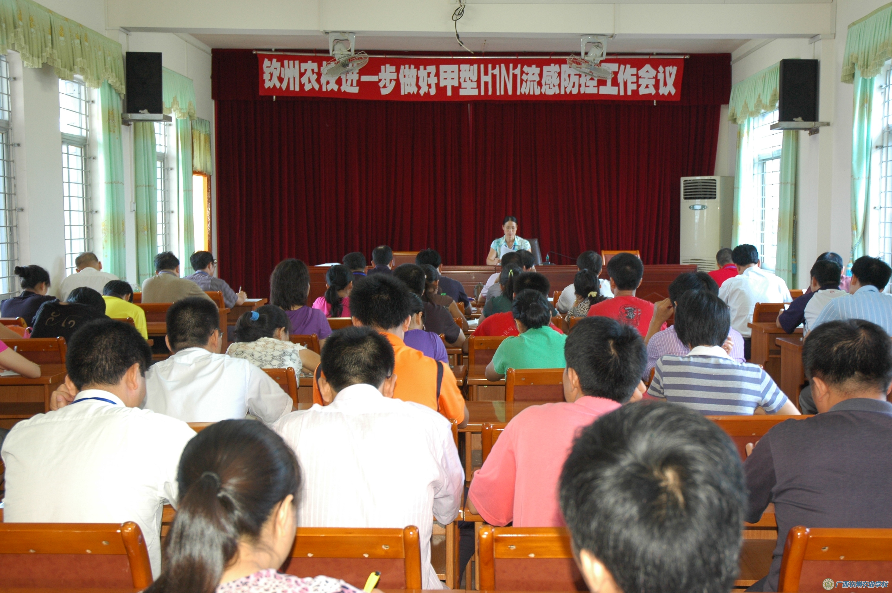 参加会议的有学校领导以及甲型H1N1流感防控工作领导小组的其他成员、2008级和2009级全体班主任。会议由学校副校长、副书记覃一静主持。