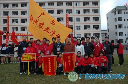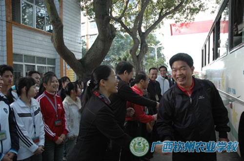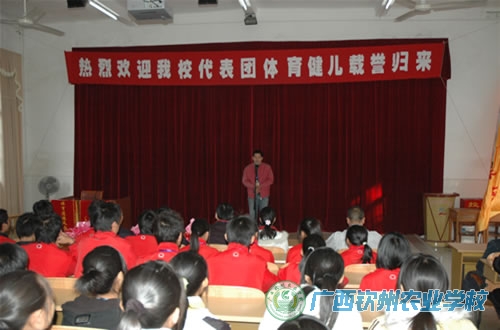 2009年11月18日下午,钦州农校鼓乐喧天,人头攒动,热闹非凡。学校领导、各相关部门负责人、学生会、团委会全体干部、青年志愿者和护校队全体成员,以及500多名师生,在中心校道列队欢迎参加区农业厅属中等职业学校第十一届学生运动会的我校代表团载誉归来,学校领导为代表团成员献上了鲜花。在一片掌声和欢呼声中,学校领导和代表团一起,走进电化教室,学校为代表团举行一个简单而隆重的欢迎仪式。在欢迎仪式上,伍国樑副校长致欢迎词,代表团领队陆武昌主席和总教练裴朝发老师分别作了参赛情况汇报。