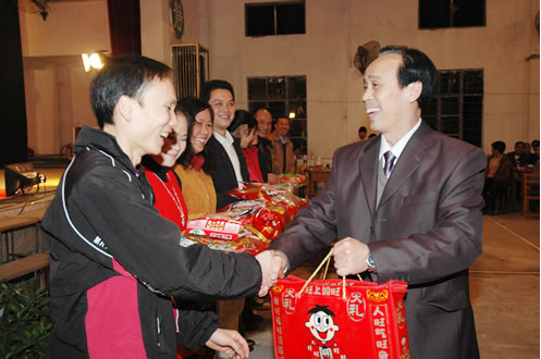头顶气球比赛趣味游戏《男扮女装》学校领导为游戏比赛获奖的工会小组颁奖