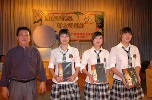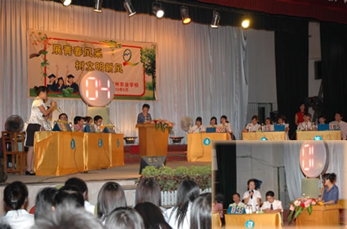 “文明礼仪知识竞赛”的比赛现场刘波校长为荣获“文明礼仪知识竞赛”一等奖的代表队颁奖伍国樑副校长作了总结讲话并为获奖的代表队颁奖覃一静副校长为获得二等奖的代表队颁奖李红调研员为获奖得一等奖的选手颁奖比赛现场技能表演现场答题参赛选手与领导合影留念