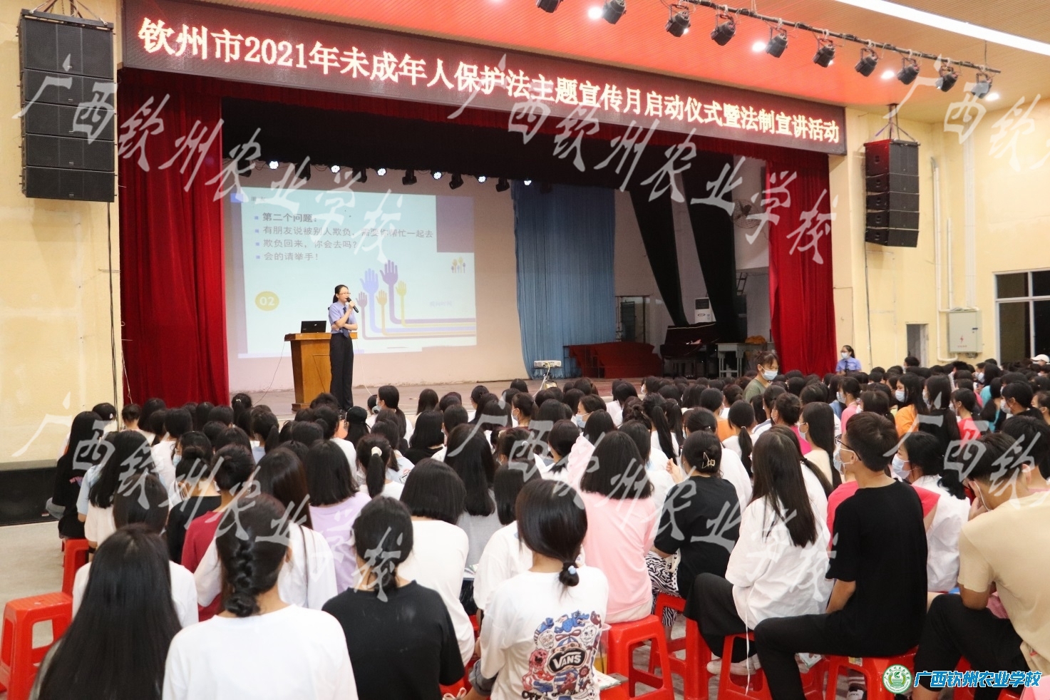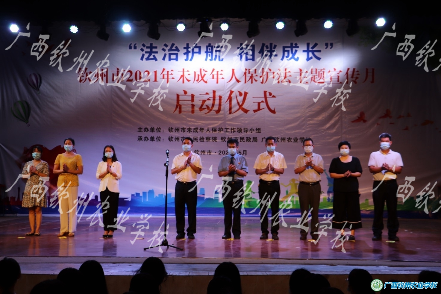 为深入贯彻落实将于6月1日正式实施新修订的《中华人民共和国未成年人保护法》,在全社会大力营造关爱未成年人健康成长的良好氛围,切实保障未成年人的合法权益,有效促进未成年人全面发展,5月31日晚,由钦州市未成年人保护工作领导小组主办,钦州市人民检察院、钦州市民政局、广西钦州农业学校承办的钦州市2021年未成年人保护法主题宣传月启动仪式在我校举行,市委宣传部、市委政法委、市人大常委会法工委、市检察院、市民政局、广西钦州农业学校等37个单位参加了仪式。