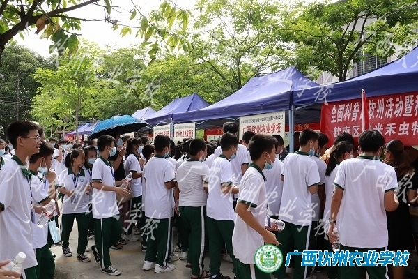 在学校大礼堂旁,设有科普教育基地科普活动体验区、“科技助力乡村振兴”科普惠农兴村计划农产品成果展示区,钦州市第三人民医院、市气象局、市农业农村局、市自然资源局、市生态环境局、市应急管理局、广西钦州坭兴陶艺有限公司等单位、企业通过发放宣传单、宣传手册、现场咨询等方式,为师生普及健康生活、节能节水、防灾减灾、应急救援等方面的科普知识。