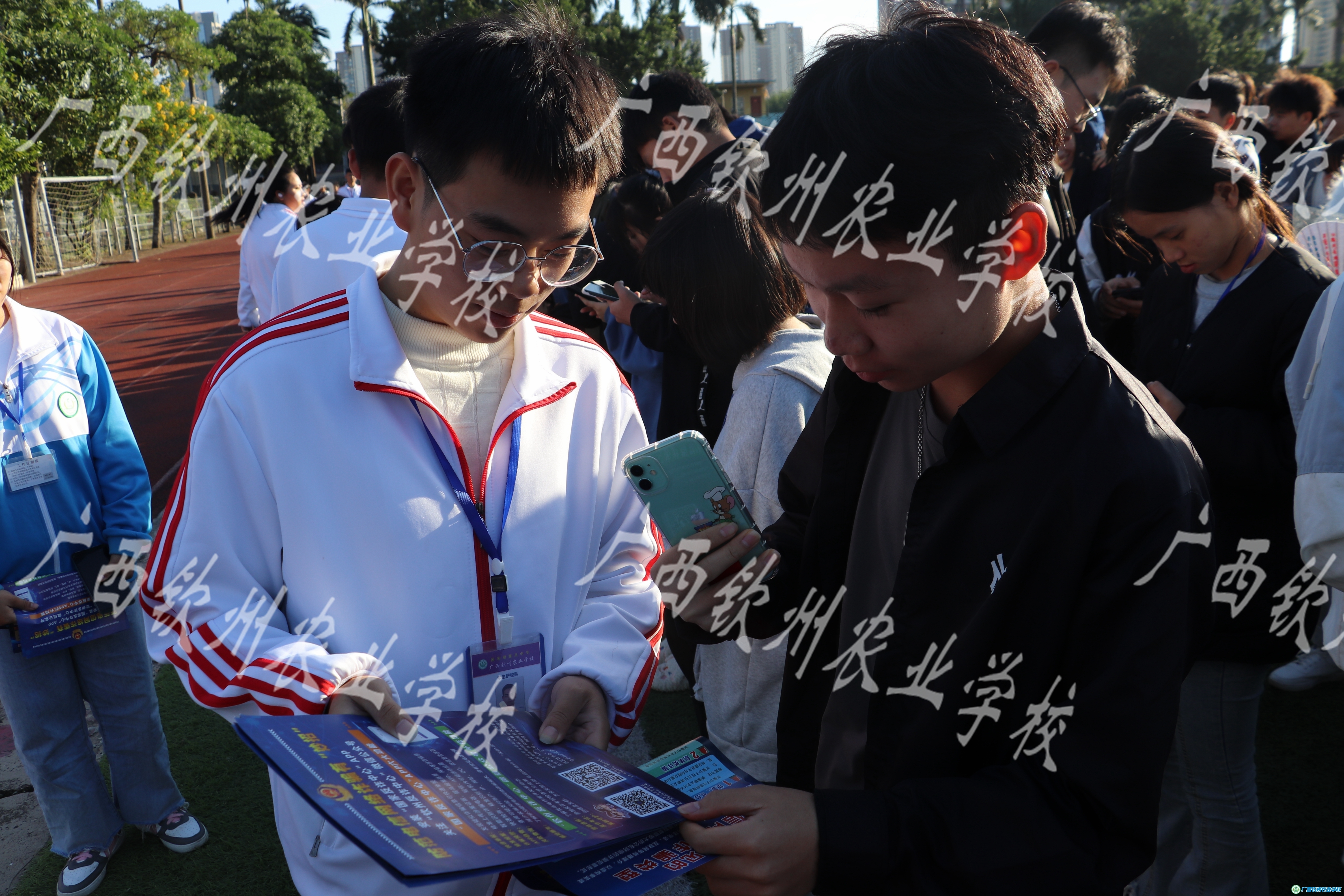 护校队干部向同学们发放宣传单以及让学生扫码下载APP(二)
