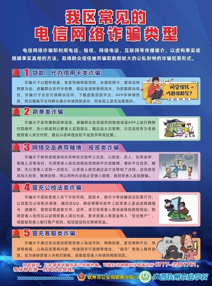 为进一步提高同学们对电信网络诈骗的鉴别能力和防范意识,有效遏制电信网络诈骗犯罪的高发势头,进一步加大防范宣传力度,有力维护校园安全和社会稳定。11月23日下午,钦州市公安局钦南分局走进我校开展“防范电信网络诈骗”专题讲座,全体学生参加了讲座。