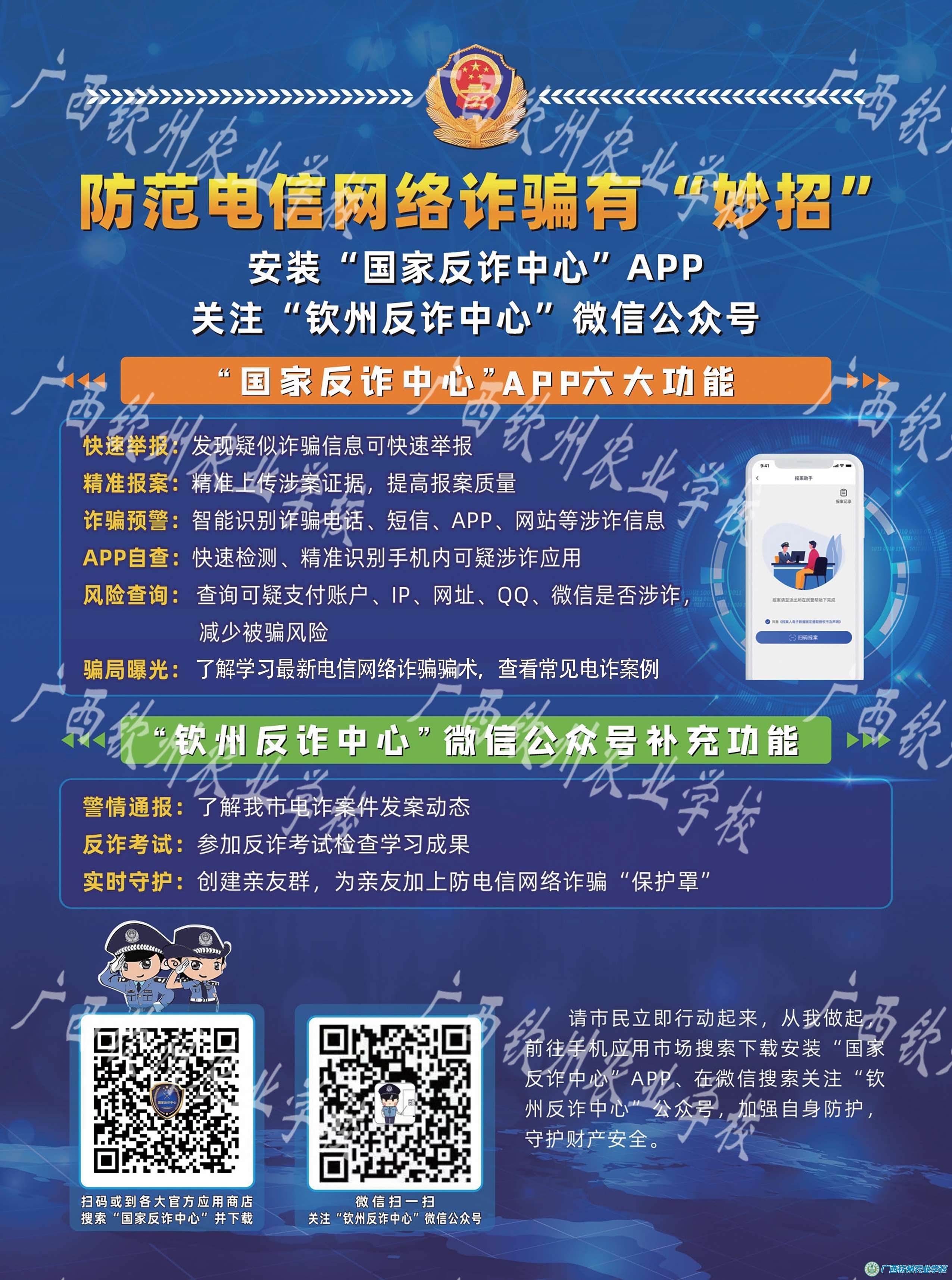 讲座开始前,学校护校队150多名学生按照安排表到各个班级发放防范电信网络诈骗宣传单以及让全校学生扫码下载“国家反诈中心APP”、扫码关注“钦州反诈中心”微信公众号。扫码结束后,钦州市公安局钦南分局刑侦大队教导员韦秀萍进行讲座,在讲座中韦指导员首先通报了近期钦南区辖区的学校以及我校发生的数起电信诈骗案件,然后结合详实案件,生动形象地对常见的电信网络诈骗方式进行了详细讲解,让同学们识别电信诈骗常见手段,提醒同学们在生活中不要贪图便宜,不要轻易相信陌生人的电话和信息,最后韦警官向同学们详细说明了“国家反诈中心APP”的使用方法,同时也建议让同学们向家长、亲戚、朋友推荐下载“国家反诈中心APP”。