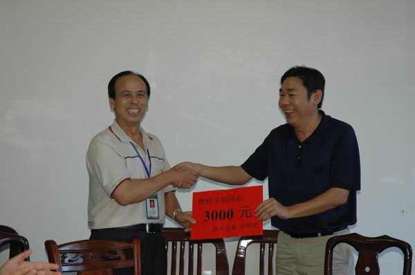 座谈会上,李日卫组长代表市委、市政府和市教育局向教师们致以了节日亲切的问候,充分肯定了我校在教育教学工作中取得的成绩,高度赞扬了教师们甘为人梯的奉献精神,对教师们的辛勤劳动和为教育事业所做的贡献表示崇高敬意,并对我校的发展提出了希望和建议:要进一步学习、贯彻《国家中长期教育改革和发展规划纲要》及自治区、钦州市的实施细则,结合校情,科学发展,做大做强中等职业教育;要进一步加强师资队伍建设,重视教师培训学习,努力提高师资水平;在专业设置、校企合作等方面做出适当调整,更好地发挥自身优势,切实为钦州市地方经济发展服务。李组长还代表市教育局给我校送上了慰问金。