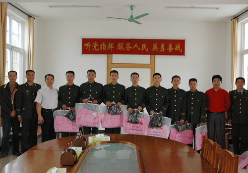 慰问组领导给退伍的老兵赠送慰问品并合影留念