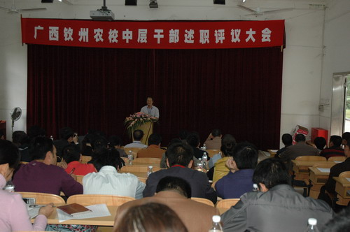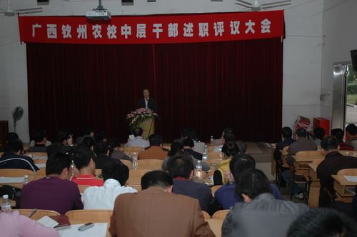 根据《广西壮族自治区事业单位工作人员考核实施办法》,为落实对干部队伍考核工作的要求,进一步加强中层干部考核管理监督机制,促进干部队伍的健康发展,强化干部队伍建设,我校于2010年12月24日下午在电化教室召开中层以上领导干部述职评议会,会议由覃一静副校长主持。会上,学校中层以上干部(校领导除外)向教职工进行了年度工作述职,全校教职工对他们的工作业绩进行了民主评议,并进行了科级后备干部推荐。