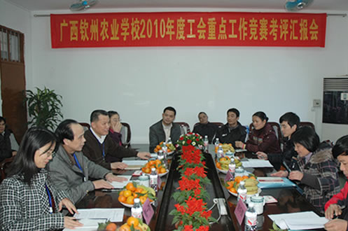 根据钦州市教育工会《关于做好2010年度市直学校工会重点工作竞赛自评的通知》(钦市教工字[2010]31号)的精神,学校工会对照年初制定的工作目标任务,按照2010年度市直学校工会重点工作竞赛考评方案的要求,认真做好各项迎评工作。1月14日下午,钦州市教育工会2010年工会重点工作竞赛考评组组长李小薇一行3人来校对我校工会2010年工会重点工作进行评估验收。考评组通过听取汇报,现场察看,核查材料等方式进行考评,考评组对我校工会2010年度工会重点工作给予了很高的评价。我校2010年工会重点工作顺利通过了评估组的现场评估验收。
