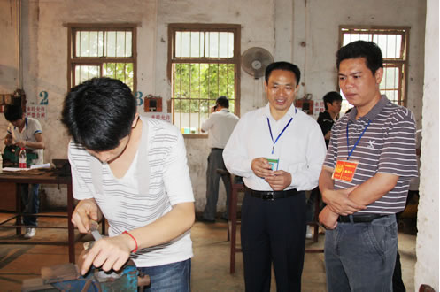 钦州市人力资源和社会保障局培训科领导(右一)和我校领导巡视钳工考试有关领导巡查摩托车维修工的技能操作考核车工考试现场维修电工考试现场