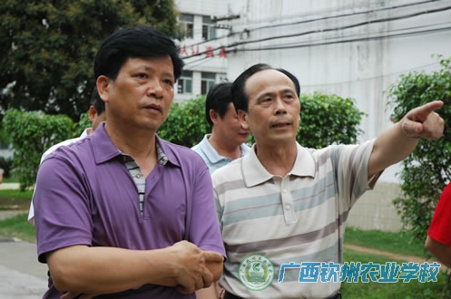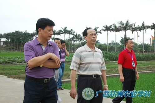 刘波校长向黄铭福局长(左)汇报学校工作 黄局长检查学校校园建设 黄局长(前左)察看学校教学田 黄局长与部分学校领导合影