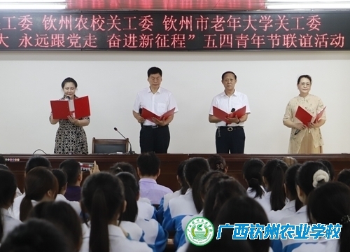 为深入推进“五老”进校园关爱工作,在“五·四”青年节来临之际,4月28日上午,钦州市关工委、钦州市老年大学关工委与我校关工委开展“五·四”青年节联谊活动。市政协原副主席、市老年大学名誉校长何敏成,市委老干部局副局长、二级调研员、市老年大学常务副校长刘晖,市关工委副主任李梅、市老科协副会长、市老年大学关工委常务副主任李灵祥,钦州农业学校副校长邓业斌,钦州农校关工委副主任农晓琼等出席了活动。